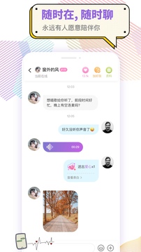 这是一款专门为声音控打造的语音聊天交友软件,在这里你会认识许多新朋友,她们会主动对你say“hello”,陪你连麦唠嗑,分享彼此生活的喜怒哀乐,和你处cp,让你不再孤单……