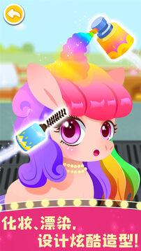 快来装扮小马:画个橘粉色腮红、涂个长睫毛、喷上blingbling的闪粉,精致的妆容完成啦。刘海挡住眼睛,快用剪刀修理一下。再喷上染发喷雾……变身彩虹小马!