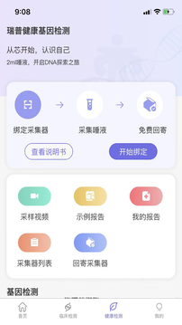 主要功能:临床肿瘤基因检测(1)样本送检:肿瘤基因检测样本信息的录入提交、送检信息查询。(2)报告查询:查询追踪样品的送检情况,获取样本检测实时状态。(3)基因检测:了解基因检测产品的检测内容,使用范围等基本信息。(4)检测问答:提供常见的送检问题和产品咨询问题的答复信息。(5)报告解读:对送检样本的报告结果进行展示。(6)解读案例:对常见的突变检测案例进行分析解读,完美解决心中疑惑。瑞普健康基因检测(1)采样视频:展示如果进行采样的视频.(2)绑定采集器:提交采集器信息,并提供采集器寄回流程,已经检测进度查询功能。(3)示例报告:展示健康检测产品的示例报告。(4)采集器列表:展示已经绑定的采集器信息(5)回寄采集器:选择需要回寄的样本,填写寄件地址,可回寄采集器。(6)我的报告:展示健康产品的报告结果信息。