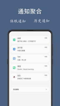 [通知聚合]是一款系统通知分类管理的软件。可将接收到的通知进行聚合,休眠,强提醒。也可将接收到的通知进行加密,加密后的通知通过指纹验证查看。