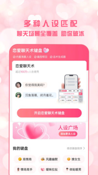 和女生聊天根本没有话题?√不知道怎么逗女生开心?√女生生气了怎么办?√见到心仪的女生紧张不敢交流?√表白为什么总是被拒绝?√……不要慌,恋爱聊天术帮助你。恋爱聊天术,一款可以轻松帮助你提高情商的App,超百万话术库,完美解决了遇到不知道怎么回复女生时的尴尬,只需搜一搜,N多精彩的回复供您选择,为你的恋情保驾护航。===我会十八般武艺,你知道吗…===-= 【话术】超百万的聊天话术,搜索对方说的话,一键复制粘贴即可轻松追到对方,轻松帮你缓解尴尬;-= 【海量】 海量干货助你快速提高聊天技巧,爱商情商全面提高;-= 【绝招】 情场绝招,招招见效,专治各种疑难杂症;-= 【输入法】 高情商聊天便捷输入法-= 【秘籍】 恋爱脱单秘籍,助你摆脱所有单身男士共性问题。-= 【人设广场】多种语气词助你聊天-= 丰富的聊天干货,海量的精选话术,精彩的视频教学,实用的聊天输入法,有效的恋爱秘籍,唯妙的恋爱绝招,帮助你解决所有情感上遇到的各种实际问题;