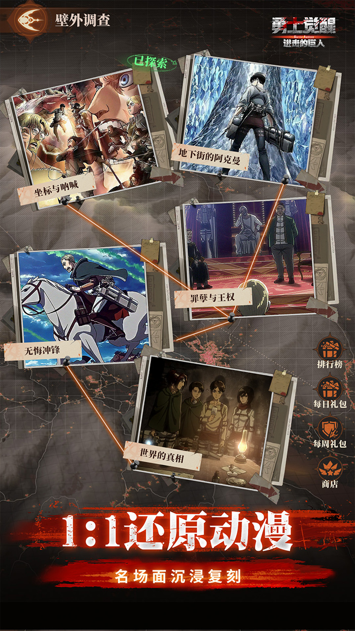 充值比例1元:10游戏货币;化身艾伦·耶格尔,坠入《勇士觉醒》的时空裂隙,以立体机动装置驰骋战场,在玛利亚墙的废墟中抵御巨人突袭,向海的彼岸,探寻墙外文明。唤醒始祖之力,洞悉世界真相,解锁巨人形态,锻造传说兵器,集结调查兵团,冲破绝望之墙,改写人类存亡的史诗!